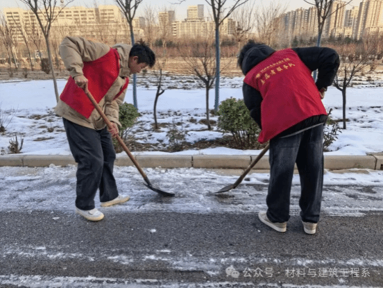 为深入贯彻落实立德树人根本任务,进一步优化实训教学环境、保障师生出行安全,大力弘扬“奉献、友爱、互助、进步”的志愿服务精神,12月21日上午,材料与建筑工程系志愿者,以“洁净实训空间,共创文明校园”为主题,开展实训楼卫生清扫与道路积雪清理专项行动,以实际行动为校园安全与整洁贡献青春力量。