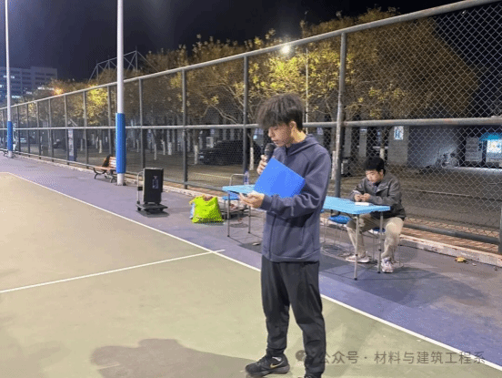 赛前培训结束后,全体人员移步至篮球场举行“材建杯”篮球比赛开幕仪式。随着主持人宣布活动正式开始,现场气氛热烈、青春洋溢。随后,裁判员代表与运动员代表分别进行了庄严宣誓,承诺将严格遵守比赛规则,公平、公正、文明参赛。