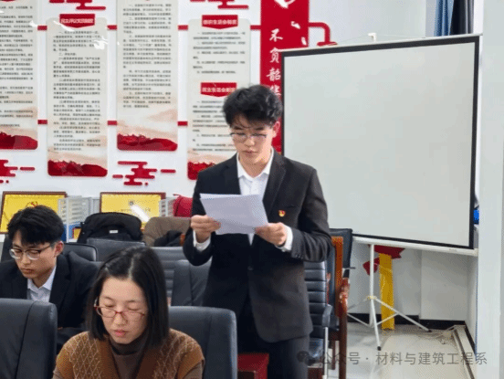 为加强党的组织建设,进一步壮大党员队伍,增强党组织的凝聚力和战斗力,保持党的先进性和纯洁性。2025年11月28日,材料与建筑工程系学生党支部在创二420会议室召开预备党员接收大会。我系党总支书记王燕、学生党支部书记赵媛媛、学生党支部全体教师党员以及刘文杰、王犇鑫等17名发展对象参加会议,本次会议由赵媛媛主持。