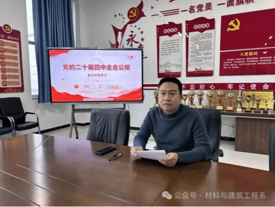 为深入学习贯彻党的二十届四中全会精神,进一步统一思想、凝聚力量,12月5日,材料与建筑工程系教工党支部在创二420会议室组织召开专题宣讲会。教工党支部书记王丙杰主讲,全体教师党员参加了本次学习活动。