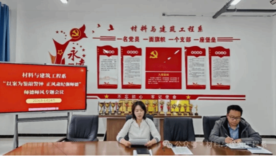 为深入贯彻落实新时代高校教师职业行为十项准则,进一步增强教师队伍的责任意识、纪律意识和规矩意识,4月24日下午,材料与建筑工程系召开“以案为鉴敲警钟 正风肃纪强师德”师德师风专题会议。会议由党总支书记王燕主持,全体教职工参加会议。