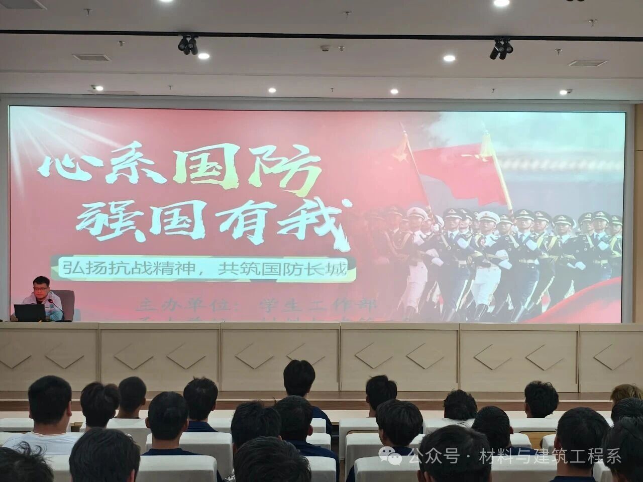 2025年9月20日是全民国防教育日,为深入推进国防教育进校园,增强全体师生的国防观念和国家安全意识,弘扬伟大抗战精神,9月20日下午,我校学生工作部特邀材料与建筑工程系军事理论辅导员老师董家瑞在德龙报告厅成功召开“弘扬抗战精神 共筑国防长城”主题讲座。25级新生代表参与,讲座现场气氛庄重而热烈。