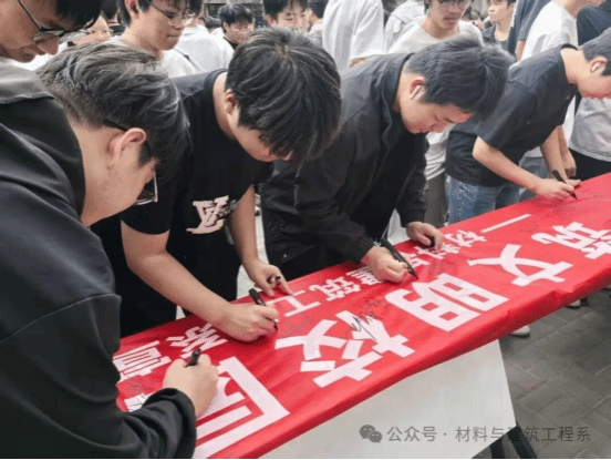宣誓倡议完毕后,同学们按照秩序依次走向印有“扬五四新风·筑文明校园”的横幅前,以笔为媒、以名立誓,一笔一画间倾注着践行文明准则、共建文明校园的坚定决心。现场秩序井然、氛围庄重,每一个签名都凝聚着对文明言行的追求,每一份承诺都将汇聚成系部文明建设的强大合力,充分展现了材建学子的良好精神风貌。